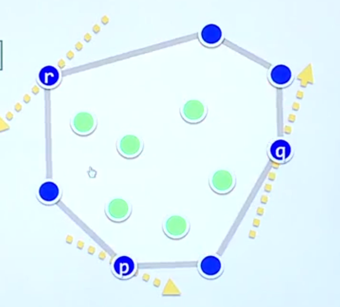 在如图所示的一个凸包内,存在两种点,对构成凸包有实质作用的点(蓝色)和没有实质作用的点(绿色)。而对构成凸包有实质作用的点则被称为极点(Extreme Points)。